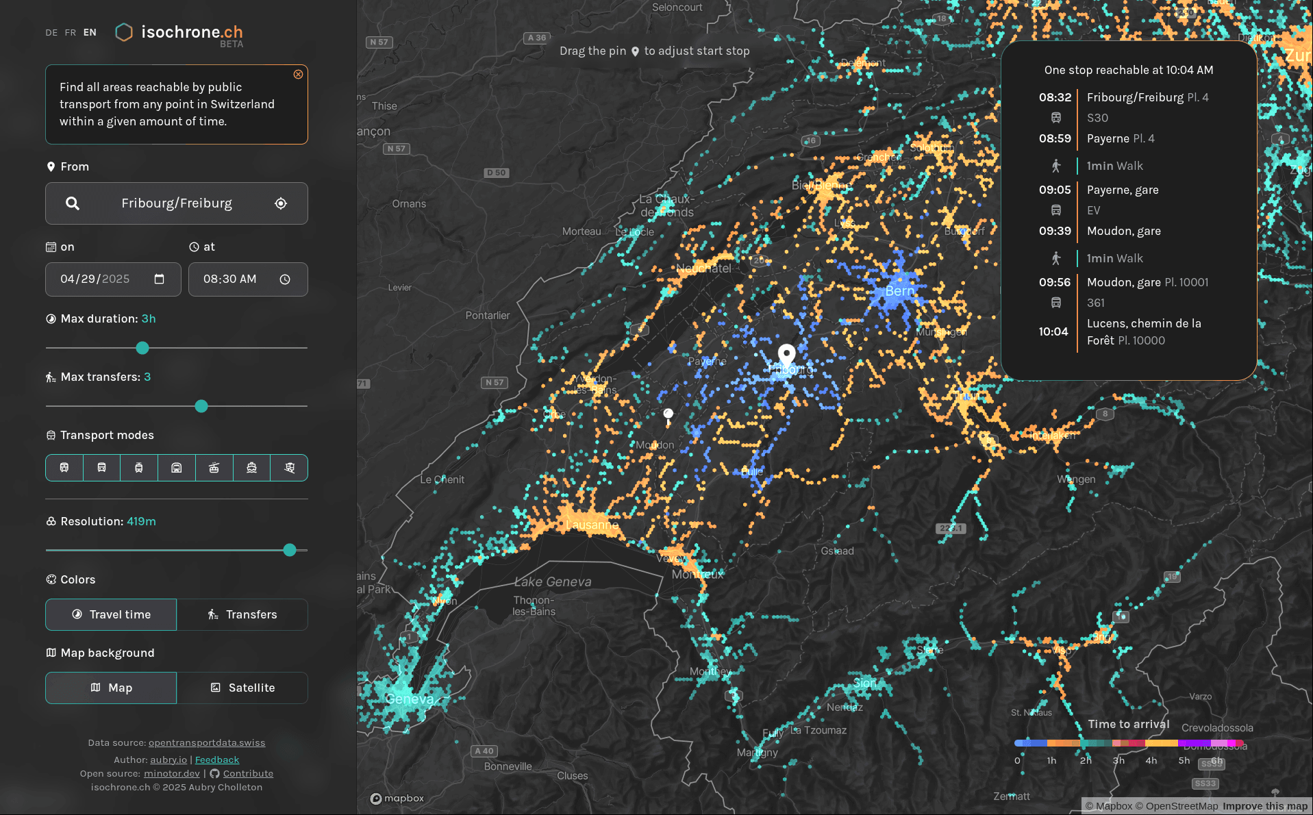 An interactive tool to find all areas reachable by public transport from any point in Switzerland within a given amount of time.